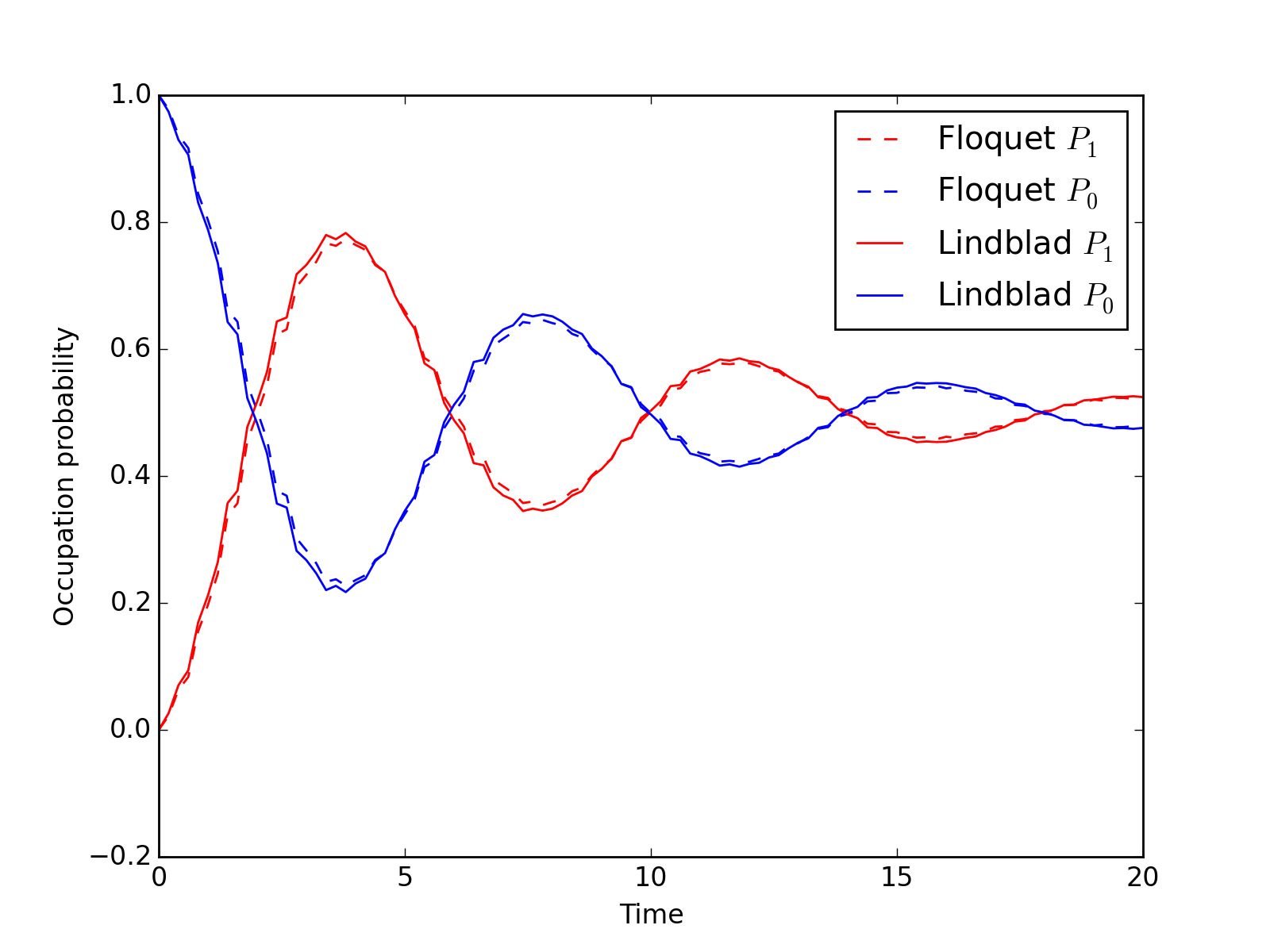 legend(("Floquet $P_1$", "Floquet $P_0$", "Lindblad $P_1$", "Lindblad $P_0$"))