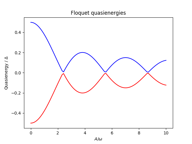 The \(t=0\) Floquet modes corresponding to the Hamiltonian (5) can then be calculated using the qutip.floquet.floquet_modes function, which returns lists containing the Floquet modes and the quasienergies